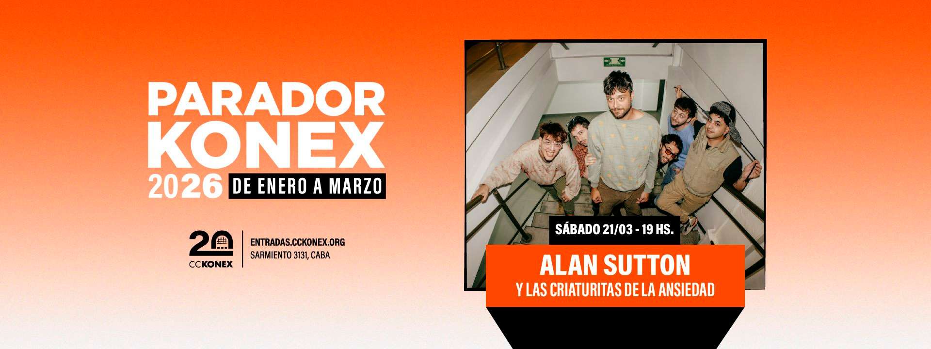 Dentro de la programación del Parador Konex, el verano sigue sumando fechas destacadas. El sábado 21 de marzo a las 19 h, será el turno de Alan Sutton y las Criaturitas de la Ansiedad, con un show especial al aire libre en el patio del Centro Cultural Konex.