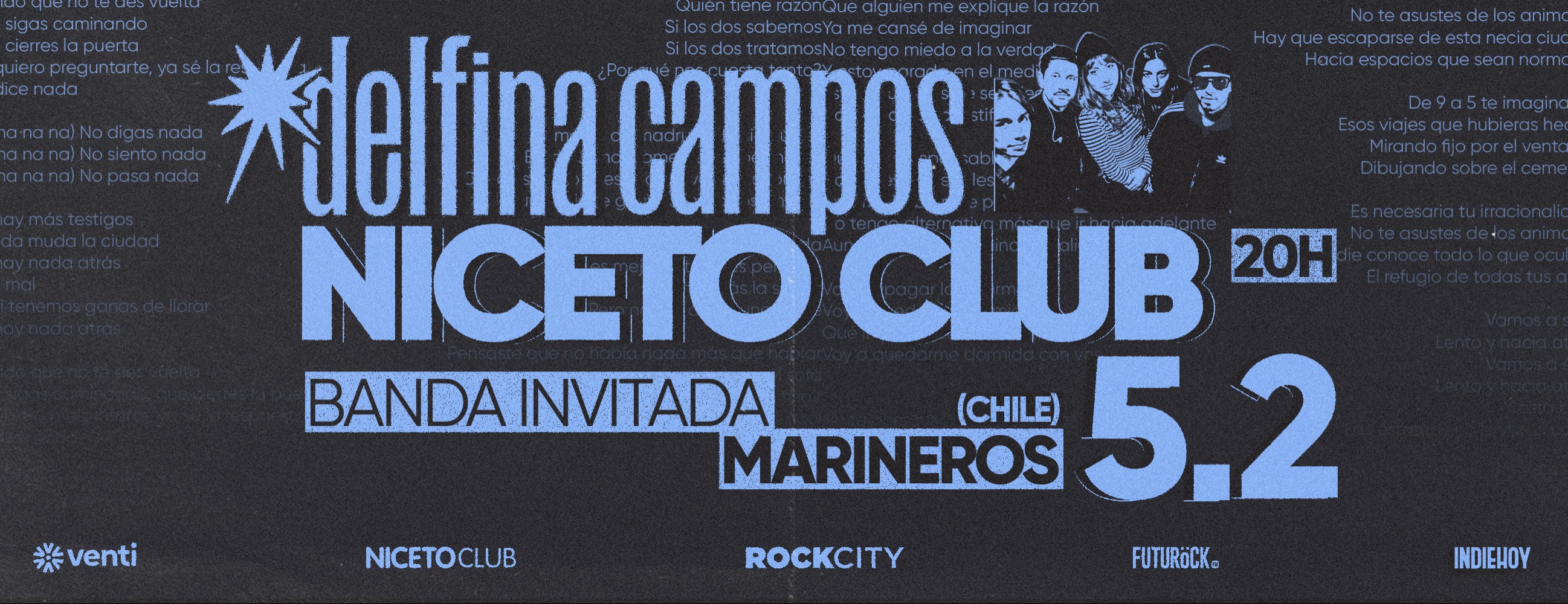 Delfina Campos se presentará junto al grupo chileno Marineros el próximo jueves 5 de febrero en Niceto Club. Las entradas cuentan con un 20% de descuento para quienes integran la Comunidad Indie Hoy. Los tickets a la venta en Venti.